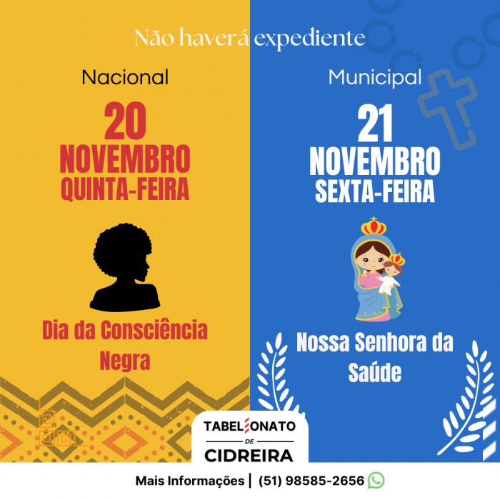 Informamos que não haverá expediente neste Tabelionato no dia 15 de Novembro (terça-feira) em motivo do feriado nacional (Proclamação da... VER MAIS [+]