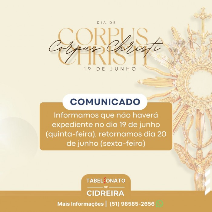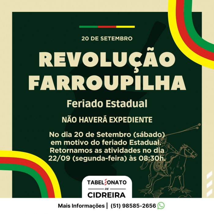 Informamos que no dia 09/05 (Sexta-feira) não haverá expediente, motivo: feriado municipalRetornamos no dia 10/05 (Sábado) às 08:30